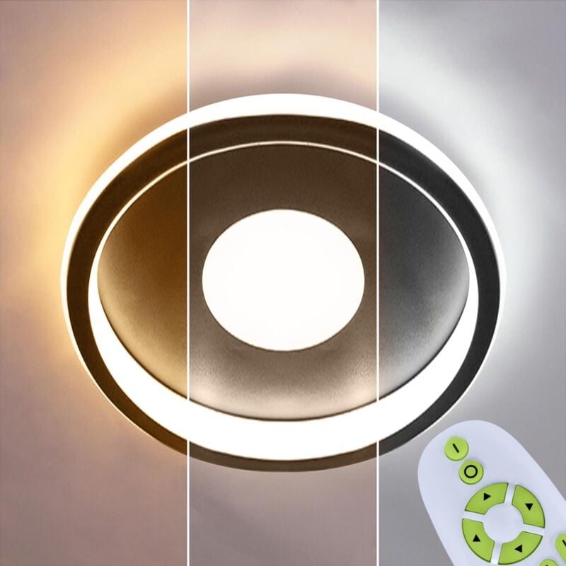 Lampade da soffitto dimmerabili - Potenza: 64 W, Colori esterni: Nero, Forma: Rotonda, Dimensioni: 40x40x8 cm, Angolo fascio: 120°, Voltaggio: 200-265 V 50 HZ. Dotata di telecomando, la luce è regolabile in bianco caldo/bianco freddo/neutro. Materiale - L'alloggiamento è realizzato in plastica ABS di alta qualità con un paralume acrilico per migliore trasmissione della luce e stabilità. Nessun abbagliamento e nessun blocco della luce a causa di problemi materiali. Risparmio energetico - Con un driver di alta qualità, la durata è fino a 50.000 ore. Di conseguenza, la plafoniera è più efficiente dal punto di vista energetico ed ecologica rispetto alle tradizionali lampadine a incandescenza, con un basso consumo energetico e un risparmio energetico superiore all'85%. LED di alta qualità - La luce è brillante e delicata, senza abbagliamento, senza sfarfallio, senza rumore, senza radiazioni UV o IR, protegge gli occhi dalla luce intensa. L'angolo di illuminazione è fino a 120°. Applicabile