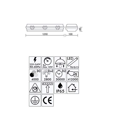 Lampada da soffitto RIGEL-VP a LED, con 2 diffusori da 18 W (luce diurna), adatta ad ambienti umidi (IP65), per ufficio, cantina, garage