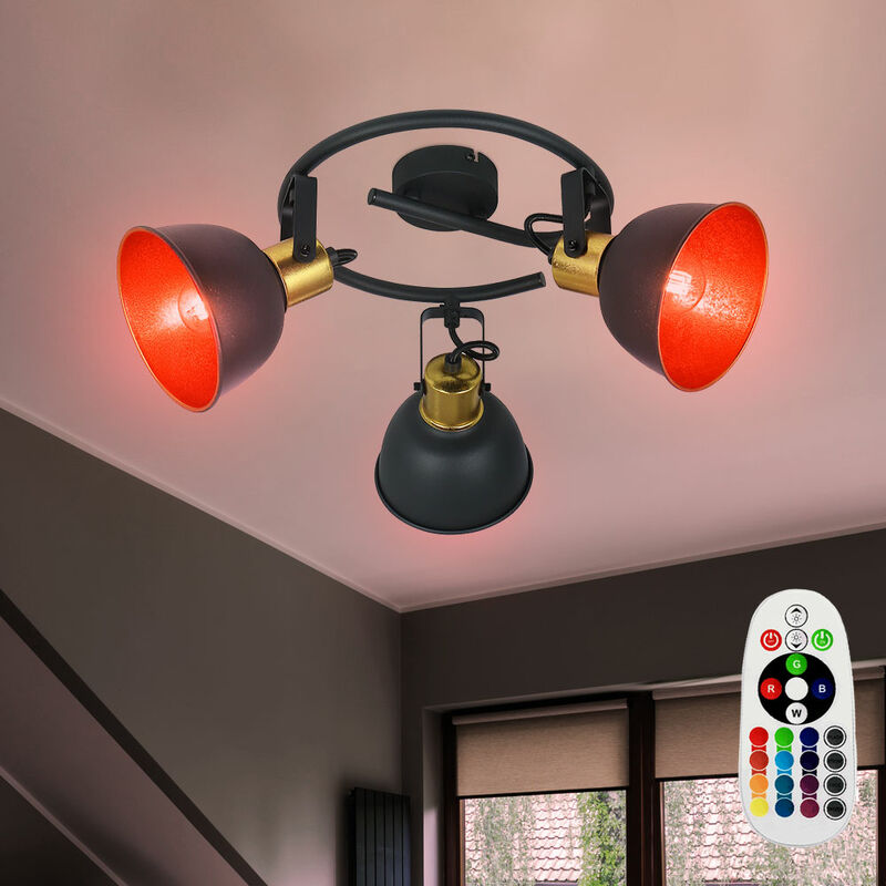 Descrizione Questo elegante faretto colpisce per il suo design raffinato. I tre paralumi rotondi e mobili, all'interno in metallo nero e foglia oro, sono fissati a un braccio a forma di e (Ø 25 cm). L'esterno, elegante metallo nero della lampada completa il design. Questo può essere fatto utilizzando il telecomando incluso Imposta le lampade LED RGB in diversi colori e garantisce così un'illuminazione d'atmosfera. Sono incluse tre lampadine LED RGB con telecomando per luce bianca e controllo RGB. Dettagli luce • Tipologia lampada: plafoniera• Materiale: metallo• Colore: nero, oro• interruttore• Spot regolabile• Grado di protezione: IP20• diametro x altezza in cm: 25x19 • montature: 3x E14• Lampada inclusa: Si • Potenza lampada: 3x 3.5 Watt• Flusso luminoso: 3x 320 Lu men• Colore della luce: bianco caldo• Telecomando: solo per la lampadina • Voltaggio: 230V, 50Hz Dettagli sorgente luminosa • Tipo di sorgente luminosa: RGB-LED Light source • Attacco: E14 • Forma: sfera• Grado di