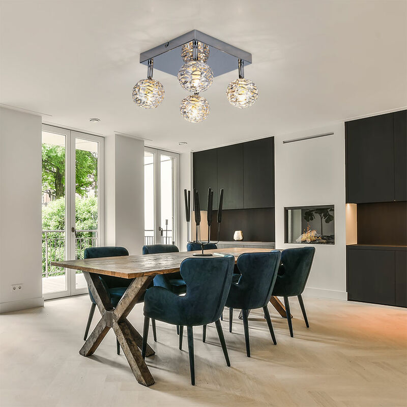 Descrizione Il moderno look cromato esalta ciascuno dei tuoi spazi abitativi. Questa lampada porta la luce nell'oscurità delle stanze più grandi.Le sfere in rete metallica sono fissate su una piastra di supporto cromata. La combinazione di entrambi si traduce in un aspetto moderno. All'interno della rete metallica, una lampadina G9 fornisce l'illuminazione. La rete metallica con le prese può essere spostata nella direzione desiderata per illuminare individualmente la stanza. Grazie alle prese G9 esistenti, sei libero di scegliere la sorgente luminosa e quindi la scelta del colore e dell'intensità della luce. Particolare lampada • Tipo di lampada: plafoniera • Materiale: metallo • Paralumi: rete metallica • Colore: cromo • Grado di protezione: IP20 • Punti mobili • Lunghezza x larghezza x altezza in cm: 25 x 20 x 15 • Lampadine: 4x G9 • Lampadina inclusa: n • Voltaggio: 230V, 50Hz