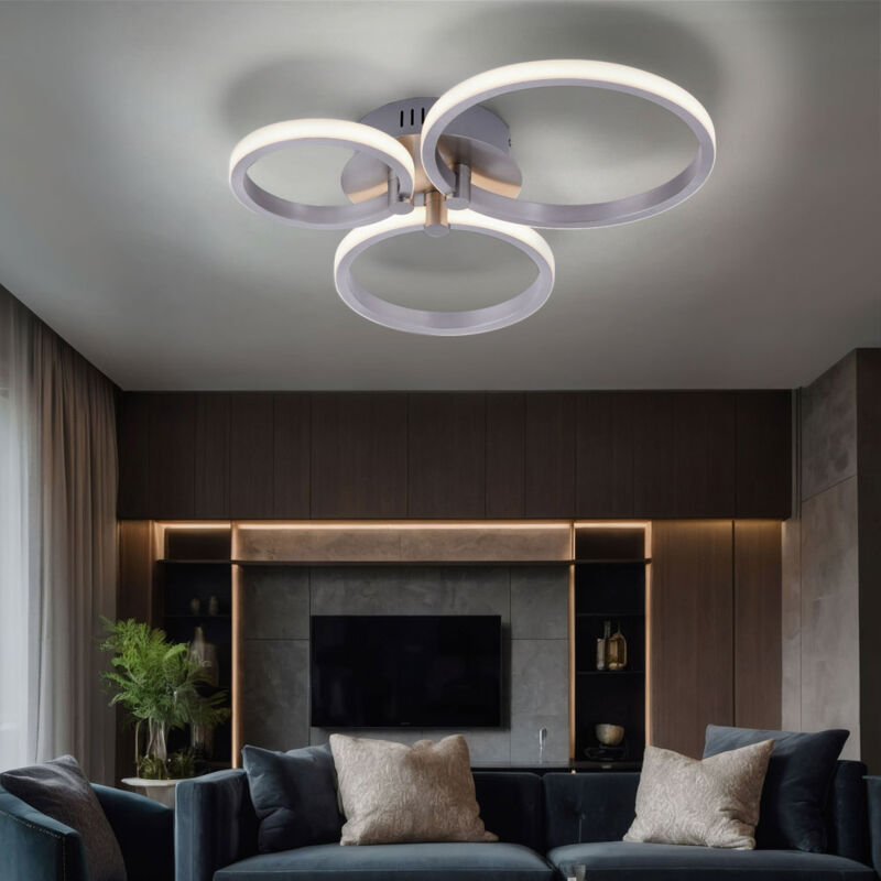 Descrizione Plafoniera con anelli per il tuo spazio abitativo. Questa elegante lampada da soffitto è ideale per un bellissimo design d'interni e può essere integrata in modo ottimale in ambienti di medie dimensioni. Gli anelli sono realizzati in plastica bianca e hanno una sorgente luminosa a LED integrata. Questi sono dotati di una potenza totale di 1.800 lumen e di una luce di colore bianco caldo di 3000K. La sorgente luminosa a LED è installata in modo permanente nella lampada. Lampada dettagli • Tipo di lampada: plafoniera • Materiale: metallo, plastica • Colore: color acciaio, bianco • Grado di protezione: IP20 • Lunghezza x larghezza x altezza in cm: 49x 39 x 8,5 • Sorgente luminosa: LED • Lampade installate permanentemente • Potenza lampada: 18 watt • Flusso luminoso: 1800 lumen • Colore della luce: bianco caldo • Alimentazione: 220-240V, 50-60Hz Dettagli lampadine • Base: LED • Flusso luminoso: 1800 lm (lumen) • Consumo energetico: 18 kWh/1000h • Temperatura colore: 3000K