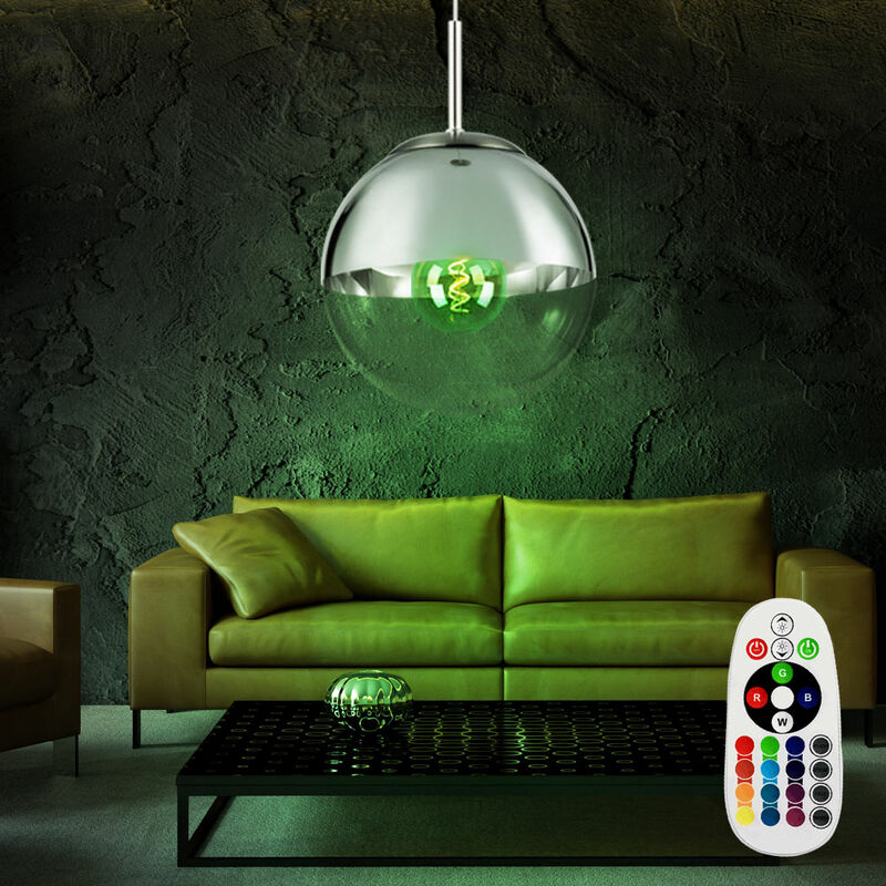 Descrizione Questa moderna lampada a sospensione convince per il suo bell'aspetto. Il diametro del paralume in vetro è di 33 cm e sporge nella stanza con un'altezza di 120 cm. Nella parte superiore, la sfera di vetro è nichel opaco. Grazie al suo design, attirerà sicuramente l'attenzione in ogni soggiorno o camera da letto. L'illuminante LED RGB può essere impostato su diversi colori e garantisce così un'illuminazione d'atmosfera. Un LED RGB Lampadina con telecomando per luce bianca e controllo RGB inclusi. Dettagli luce • Tipo di lampada:Lampada a sospensione• Materiale: Metallo • Paralume: Vetro• Colore: nichel opaco, Cromo, trasparente • Diametro x altezza in cm: 33 x 120 • Attacco: 1x E27 • Lampadina inclusa: Sì • Potenza Lampadina: 1x 6 watt• Flusso luminoso: 1x 470 lumen• Colore luce: bianco caldo• Telecomando: solo per RGB LED illuminante • alimentazione: 230V, 50 Hz Dettagli sorgente luminosa • Tipo di lampadina: LED RGB • Attacco: E27 • Materiale: metallo argento, plastica