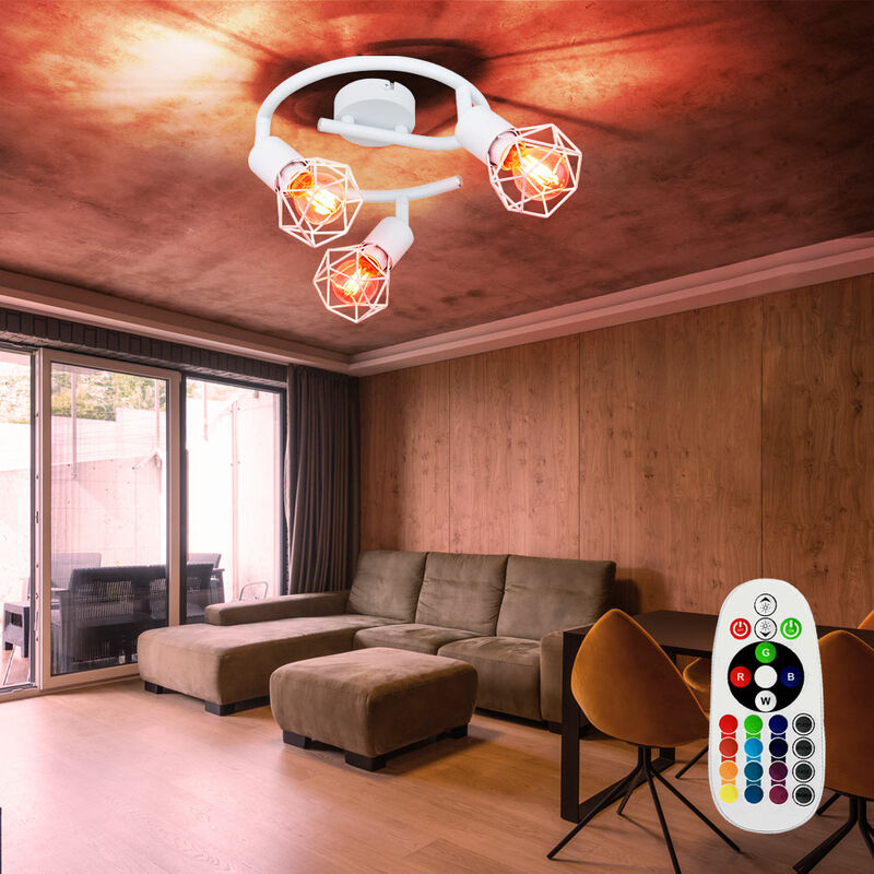 Descrizione Il faretto da soffitto colpisce per il suo design elegante. Le tre gabbie metalliche mobili, bianche e a forma di diamante attaccate a un braccio a forma di E dovrebbero attirare l'attenzione di tutti. Con ulteriori faretti di questa serie puoi completare il quadro nelle tue quattro pareti. La lampada LED RGB può essere trasformata in diversi colori e quindi garantire un'illuminazione d'atmosfera. Rispetto alle luci normali, i faretti a LED consumano solo una minima quantità di elettricità e sono in consumo anche in regime di risparmio energetico luci. Ciò salva l'ambiente e il tuo portafoglio. Tre lampade a LED RGB di alta qualità a risparmio energetico con telecomando per luce bianca e controllo RGB sono incluso nella fornitura! Dettagli lampada • Tipo di apparecchio: faretto rotondo• Materiale: metallo, bianco• Paralumi: gabbia metallica, bianco• punti mobili• diametro x altezza in cm: 23x18 • attacchi: 3x E14• lampadine incluse: si• lampadine: 3x 3.5 Watt• flusso