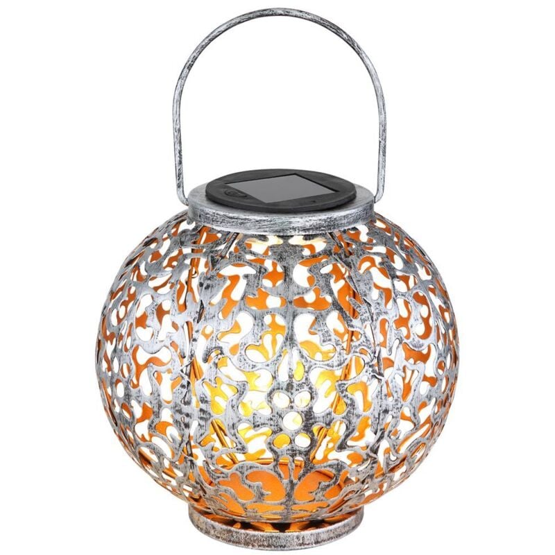 Descrizione Questa lampada solare sferica in metallo color argento (ø 20 cm) può essere utilizzata in modo flessibile nella tua area esterna. Ha un gancio che gli permette di essere ammirato sia in posizione sospesa che in piedi (es. Su un tavolo). L'elegante motivo dei fianchi in metallo è proiettato verso l'esterno dalla lampada LED ad energia solare. La luce bianca piacevolmente calda (3000 Kelvin) della lampada LED crea un'atmosfera suggestiva anche nel tuo giardino, terrazzo o balcone. La sorgente luminosa a LED è integrata nella lampada. Dettagli lampada • Tipo di apparecchio: lampada solare • Materiale: metallo • Colore: argento, antico • Grado di protezione: IP44 • Batteria inclusa: sì • Tempo di combustione: circa 6-8 ore • Diametro x altezza in cm: 20 x 29 • Sorgente luminosa: 1x LED • Lampadine incluse: Sì (installate in modo permanente) • Colore della luce: bianco caldo • Temperatura colore: 3000K • Voltaggio: 3V