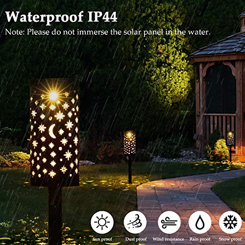 ★【IMPERMEABILE & DUREVOLE】 Grazie alla protezione impermeabile IP44, non devi preoccuparti che la luce solare del giardino esterno sia danneggiata dalla pioggia. Possono essere usati tutto l'anno. Il rivestimento anticorrosivo sulla superficie del metallo è efficace nel prevenire la corrosione