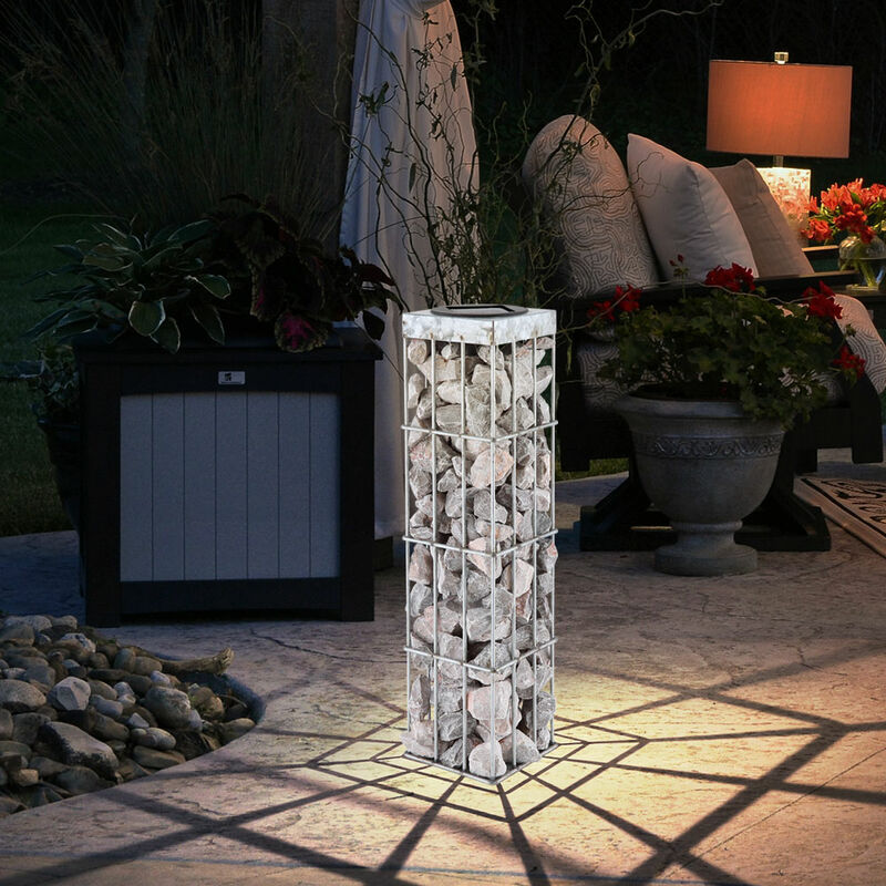 Descrizione Questa lampada solare cuboide (10x10x40 cm) colpisce per il suo bel design in metallo argentato. Puoi riempire la griglia metallica con pietre (pietre non incluse), che vengono poi illuminate dalla luce bianca piacevolmente calda (3000 Kelvin) della lampadina LED a energia solare. Ciò ti consente di creare un ambiente elegante nella tua area esterna. L'illuminante è installato in modo permanente nella lampada. Particolare lampada • Tipo di lampada: lampada solare • Materiale: metallo • Argento • Grado di protezione: IP44 • Picchetto a terra • da riempire con pietre (non incluse) • incluso 1xAAA Ni-Mh 300mAh • Autonomia circa 6-8 ore • Lunghezza x larghezza x altezza in cm: 10x10x40 • Presa: 1x LED (installato in modo permanente) • Lampadina inclusa: sì • Potenza della lampada: 1x 0,06 watt • Colore della luce: bianco caldo • Temperatura colore: 3000 K • Tensione: 3V
