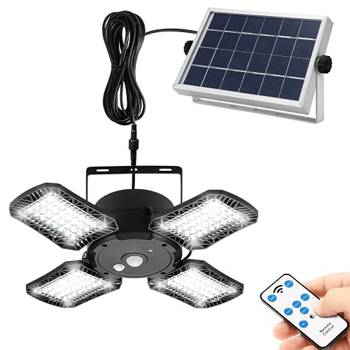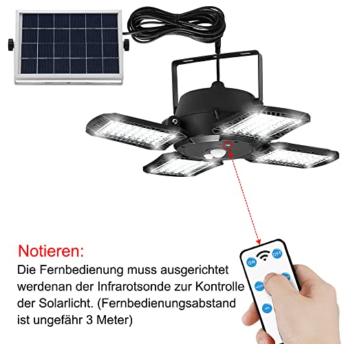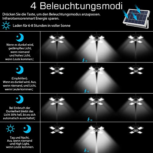 Luci solari regolabili ad angolo e luminose: lampada a sospensione solare a quattro pale. Ogni foglio può essere regolato a 120 °, in modo che la luce possa essere orientata esattamente dove è necessario. Questa lampada di sicurezza solare ha 128 LED bianchi progettati per l'illuminazione ad altissima luminosità in una vasta gamma. Produca oltre 1000 lumen.