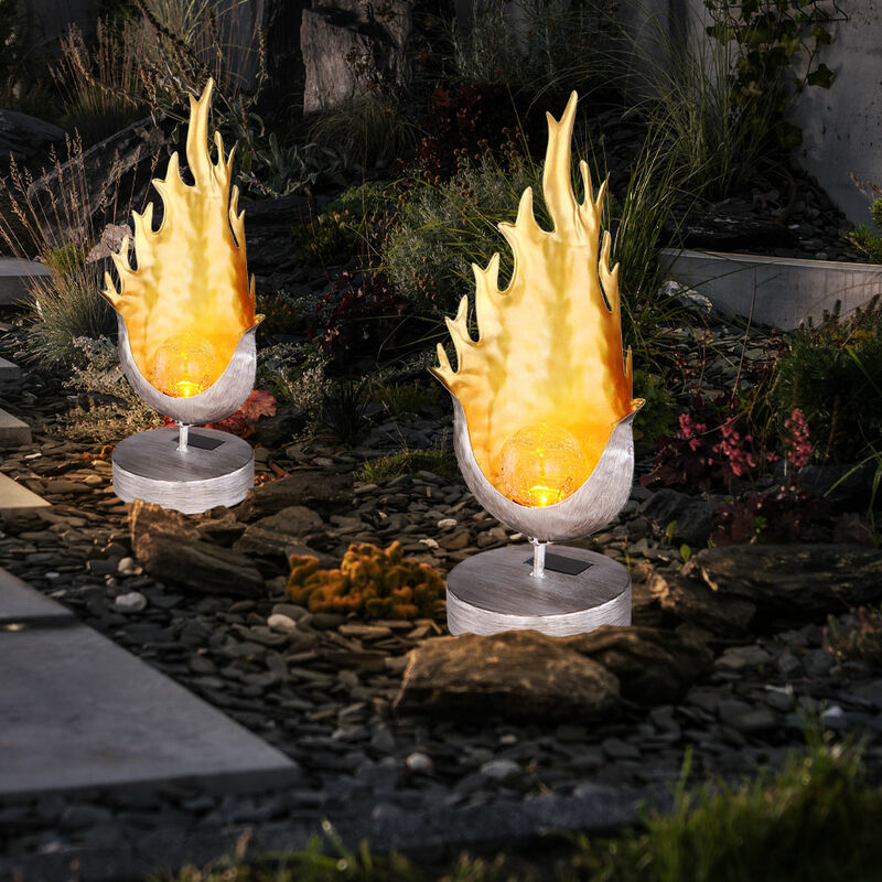 Descrizione Questa luce solare decorativa è realizzata in metallo argento e oro con un design a fiamma. Al centro della lampada si trova la sorgente luminosa a LED, che è circondata da una sfera di vetro nel design crackle. Grazie alla sua ottica e all'effetto fuoco integrato della lampadina a LED, questa lampada attira davvero l'attenzione e valorizzerà visivamente l'area scelta. Grazie alla batteria ricaricabile integrata, questa luce solare si ricarica durante il giorno ed emette la sua luce immagazzinata per 6-8 ore al buio. La lampadina a LED è installata in modo permanente nella lampada. La fornitura include due luci! Lampade di dettaglio • Tipo di lampada: lampada solare • Materiale: metallo, vetro • Colore: argento, oro • Sfera di vetro scoppiettante • Effetto fuoco • Interruttore • Batteria inclusa: sì • Autonomia: circa 6-8 ore. • Grado di protezione: IP44 • Lunghezza x larghezza x altezza in cm: 17,5 x 13 x 36,5 • Illuminante: 1x LED • Lampadine incluse: Sì (installate in