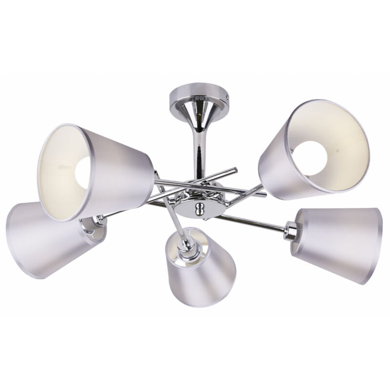 Elegante plafoniera, paralumi conici in tessuto - irrigidito internamente in PVC. I colori grigio e argento dei paralumi abbinati al cromo lucido sottolineano l'eleganza, dedicata agli interni moderni. I bracci girevoli permettono di cambiare i paralumi Materiale: base in acciaio, paralume in tessuto/PVC Colore base: nichel satinato Altezza: 40 Larghezza: 56 Profondità: 56 Dimensioni (altezza/larghezza/profondità): 40x56x56 Peso (netto): 2,20. LED integrato: No Numero di sorgenti luminose: 5 Include una sorgente luminosa: No Numero di sorgenti x base: 5xE14