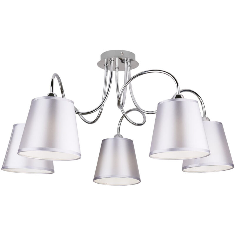 Plafoniera elegante e semplice, paralumi conici in tessuto - irrigidito internamente in PVC. I colori grigio e argento dei paralumi abbinati al cromo lucido sottolineano l'eleganza, dedicata agli interni moderni Materiale: base in acciaio, paralume in tessuto/PVC Colore base: cromo Altezza: 36 Larghezza: 70 Profondità: 70 Dimensioni (altezza/larghezza/profondità): 36x70x70 Peso (netto): 1, 18 LED integrati: No Numero di sorgenti luminose: 5 Sorgente luminosa inclusa: No Numero di sorgenti x base: 5xE14