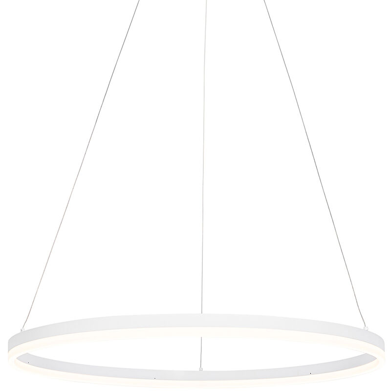 QAZQA Lampada a sospensione di design bianca 80 cm con LED dimmerabile a 3 fasi - Anello Video Questo Anello è una lampada a sospensione elegante e moderna. La parte superiore dell'anello è bianca e la parte inferiore è costituita da un anello LED integrato. L'anello LED ha 60 Watt, 2.700 Kelvin e fornisce 6777 lumen. Questa lampada a sospensione ha un sistema di regolazione integrato molto speciale. La lampada è dimmerabile in tre fasi. Ciò significa che puoi scegliere la tua posizione di oscuramento. Nella posizione 1 la lampada brilla per il 100%, nella posizione 2 per il 60% e la posizione 3 è una luce estremamente accogliente: allora la lampada brilla solo per il 30%. Quando si preme l'interruttore, la lampada mostra automaticamente la sua gamma di posizioni. Premendo nuovamente l'interruttore, scegli una modalità luce, che spegne anche la lampada. Se poi premi di nuovo l'interruttore, la lampada ha la modalità di luce che hai scelto. Questo anello ha un diametro di 80 cm e