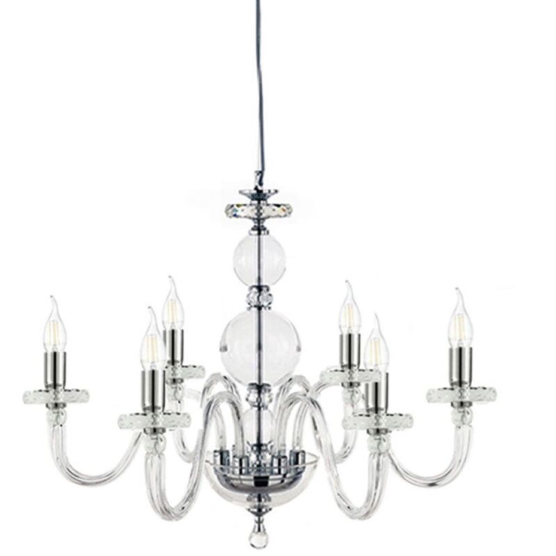Lampadario BACH realizzato in vetro trasparente lavorato a mano con dettagli in metallo. Cavi in acciaio regolabili in lunghezza. Questa sospensione moderna puo' adattarsi in modo unico e originale in ogni ambiente di casa per esempio nel soggiorno, salone o camera da letto. CARATTERISTICHE Colore: Cromo Materiale: Vetro, metallo Tipologia: Lampada a sospensione Modello: 8 luci Altezza max: 215 cm Diametro: 84 cm Dimmerabile: NO Illuminazione: 8 x E14 (L'attacco E14 permette di installare lampadine a LED, fluorescenti o alogene non incluse). Input: 220-230V