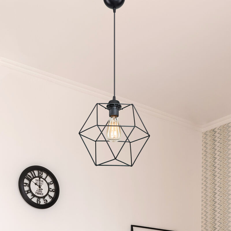Lampada a sospensione l modello rappresenta lo stile industriale che si abbina perfettamente ad un arredo moderno prestando personalitá originale all'ambiente Descrizione: - lampada da soffitto con paralume a gabbia (poligono) - una fonte luminosa - illumina lo spazio con luce intensa Dati tecnici: - Attacco lampadina: 1 x E27, max. 20W (lampadina esclusa) - Tensione: 230V, 50Hz - Tipo di interruttore: a muro Materiale: Metallo Colore: Nero Dimensioni: - Altezza completa: 73 cm - Paralume a gabbia (AxL): 28 x 28 cm La spedizione include: 1 x Lampada da soffitto [senza lampadina] Prodotto di [lux.pro]