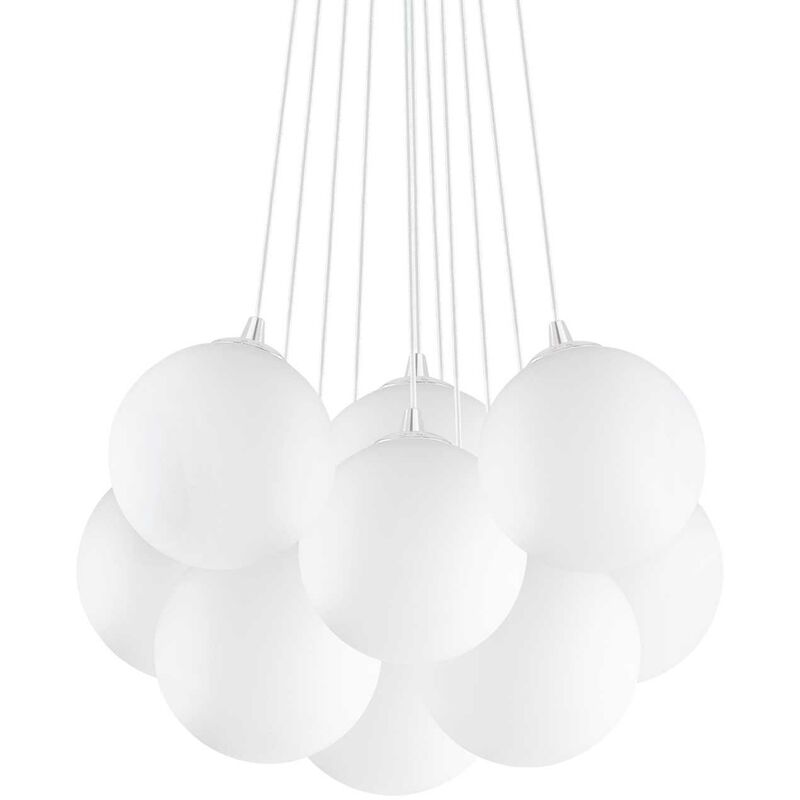 Lampada a sospensione bianco D 580 x H min 430 - max 1300 mm Caratteristiche: Lampadina inclusa=No Kit fissaggio=No Attacco lampada=E14 Volt=220-240 V AC Watt=E14 max 11 x 40W Finitura=bianco Colore rosone=bianco Materiale=Vetro Dimensioni= D 580 x H min 430 / max 1300 mm