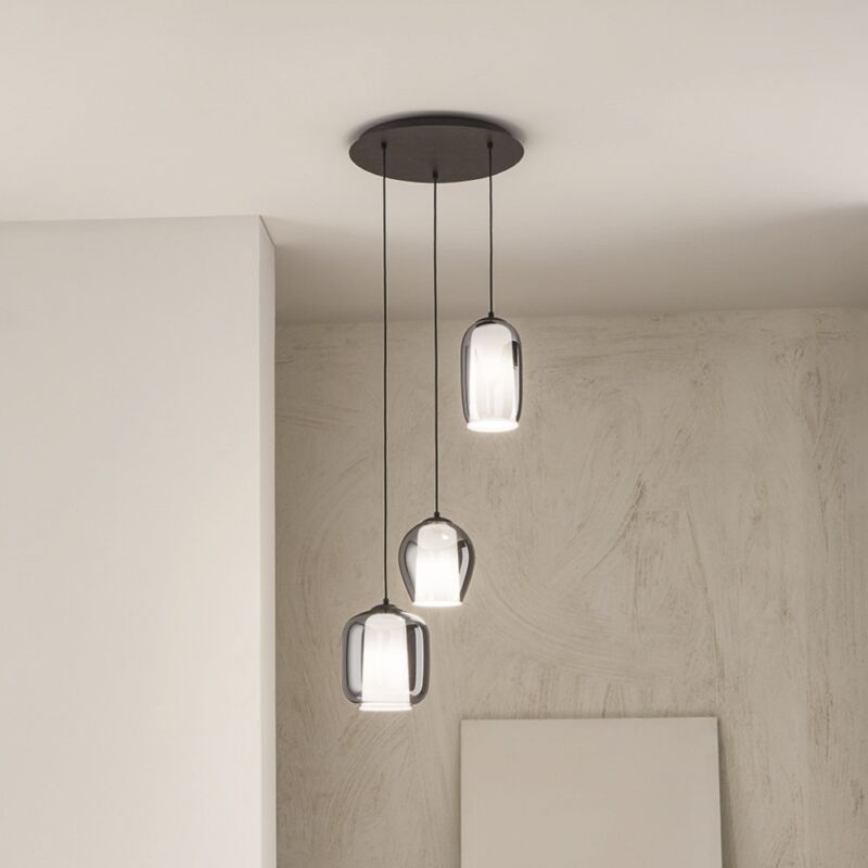 Lampada a sospensione BONNIE dal design lineare e contemporaneo, che si presenta con un rosone a soffitto in metallo verniciato Nero dal quale pendono 3 diffusori realizzati in vetro soffiato fume', con illuminazione diretta verso il basso grazie all'apertura inferiore della sfera. Cavo regolabile in lunghezza, portalampada con attacco E27. Opera di luce dalla forma morbida e soave, adattabile ad ambiente contemporanei e moderni o a stili retro'/vintage. CARATTERISTICHE Colore: Fume' Materiale: Metallo e vetro soffiato Tipologia: Sospensione Modello: 3 Luci Diametro: 45 cm Altezza: 279 cm Dimmerabile: NO Illuminazione: 3 x E27 (L'attacco E27 permette di installare lampadine a LED, fluorescenti o alogene) Lampadine non incluse Input: 220-230V