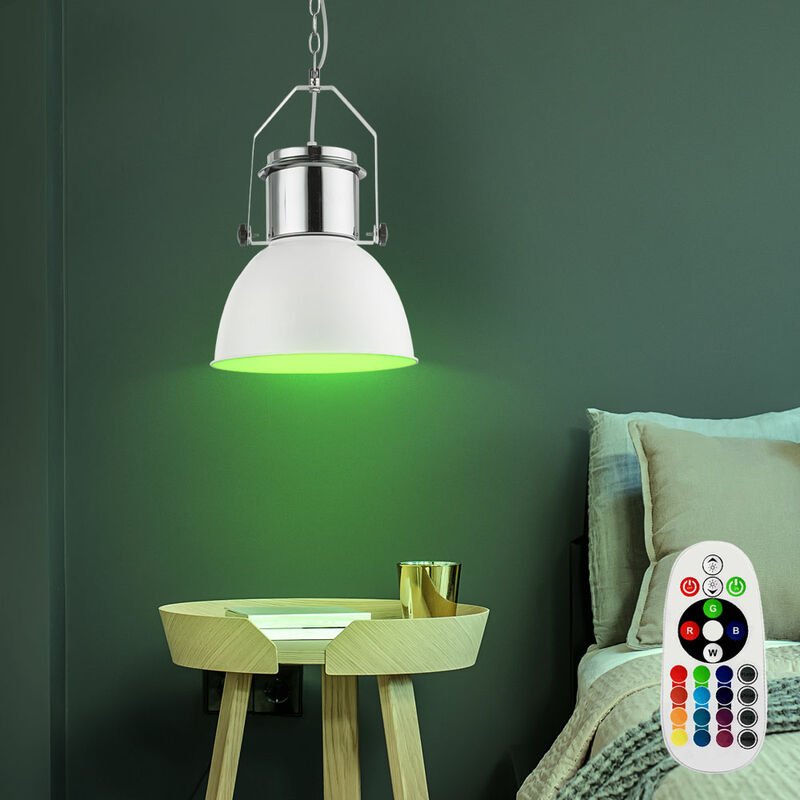 Descrizione La straordinaria lampada a sospensione attira l'attenzione in ogni zona giorno. La lampada a sospensione cromata appesa a una catena (con un cavo in tessuto nero) ha un aspetto elegante e moderno con il suo paralume in metallo bianco. Utilizzando il telecomando in dotazione, la lampadina LED RGB può essere impostata su diversi colori e garantisce così un'illuminazione d'atmosfera. dettagli apparecchio • Tipo di lampada: lampada a sospensione• Materiale: cromo, metallo• Colore: bianco• diametro x altezza in cm: 27 x 120 • attacco: 1x E27• lampadine incluse: Sì• Potenza lampada: 1x 9 watt• Flusso luminoso: 1x 806 lumen• Colore luce: bianco caldo• Voltaggio: 230V, 50Hz Dettagli dell'illuminante • Tipo di sorgente luminosa: RGB-LED • Attacco: E27 • Materiale: metallo argento, plastica • Colore luce: Modalità colore RGB (16 colori selezionabili) • Flusso luminoso: 806 lm (lumen) • Consumo energetico: 9 kWh/1000h • Temperatura colore: 3000 K (Kelvin) • Colore