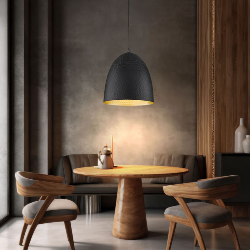 Descrizione Non è bello ritrovarsi la sera con tutta la famiglia, i vicini o gli amici, parlare della giornata trascorsa e fare progetti per il futuro? Allora manca solo un'illuminazione piacevole che crei l'ambiente giusto per lunghe conversazioni. Con la nostra lampada a sospensione otterrete una piccola lampada da sala da pranzo abbastanza grande da illuminare in modo ottimale tavoli da pranzo di piccole e medie dimensioni. Mettiti comodo a casa tua Con questa lampada ti sentirai ancora più a tuo agio nelle tue stanze. Il paralume crea un piccolo cono di luce che illumina in modo ottimale il tuo tavolo da pranzo. La luce ha un'influenza decisiva sul nostro umore. Migliori sono le condizioni di illuminazione, più a lungo rimarrai seduto, converserai e ti lascerai trasportare. Lampada a sospensione con contrasti cromatici di alta qualità I bellissimi contrasti cromatici del paralume attirano l'attenzione a prima vista. Dall'esterno l'ombrello è realizzato in nero opaco, all'interno