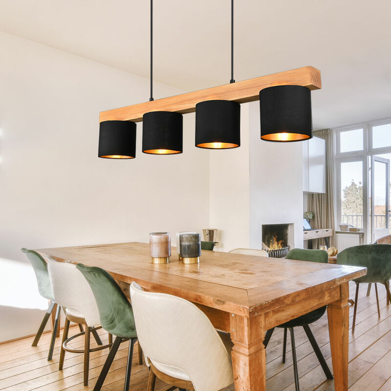 Descrizione In un emozionante mix di materiali, questa lampada a sospensione dona molto fascino agli spazi abitativi! I materiali naturali, il legno e il tessuto forniscono calore ottico e creano un quadro d'insieme armonioso. I paralumi in tessuto decorativo in nero / oro danno un tocco di modernità. Per un'illuminazione a risparmio energetico si consiglia l'utilizzo di una sorgente luminosa a LED. Le lampadine non sono incluse nella fornitura. Particolare lampada • Tipo di apparecchio: apparecchio a sospensione • Materiale: legno naturale, tessuto • Colore: nero, oro, naturale • Grado di protezione: IP20 • Classe di protezione: 1 • Regolabile in altezza • 4 fiamme • Altezza x larghezza x profondità in cm: 150x75x12 • Peso: 2,09 kg • Prese: 4x E14 • Lampadina inclusa: No • Potenza della lampadina: massimo 4x 28 watt • Alimentazione: 230V, 50Hz
