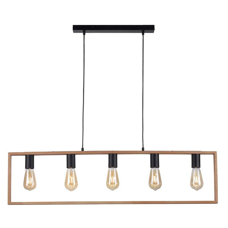 Descrizione La lampada a sospensione FRAME a cinque luci può essere integrata particolarmente bene sopra il tavolo da pranzo. Le cinque lampade possono essere selezionate a piacere. Le lampade a incandescenza sono particolarmente efficaci perché sono visibili alla vista e costituiscono una parte essenziale dell'aspetto generale della lampada. La struttura rettangolare della lampada è realizzata in legno di acacia. Grazie al mix di materiali, la lampada a sospensione si abbina facilmente a stili di arredamento moderni e crea un'atmosfera familiare e accogliente. Dettagli • Colore: nero • Attacco: E27 • Potenza lampadina in watt: 60W (watt) • Grado di protezione IP: IP20 • Materiale 1: ferro • Materiale 2: cavo nero • Materiale 3: legno • Dimensioni LxLxA: 100 cm x 6 cm x 120 cm