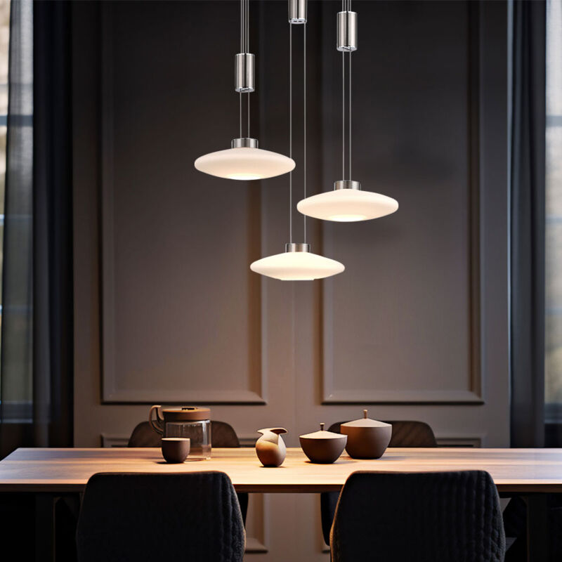Descrizione La lampada a sospensione rotonda a tre luci fornisce la fonte di luce ottimale nel vostro soggiorno! Dotato della funzione SimplyDim, può essere facilmente regolato utilizzando il normale interruttore a muro di casa. I paralumi rotondi in vetro brillano di una calda luce bianca di 3000 Kelvin. Inoltre, la lampada a sospensione color acciaio dispone di una funzione di memoria, il che significa che quando viene riaccesa è nuovamente attiva l'ultima impostazione selezionata. Utilizzando il meccanismo a puleggia integrato, ogni singola luce può essere variata in altezza da 1200 mm a 2000 mm e adattata alle vostre esigenze. La lampada da soggiorno con il suo design senza tempo si adatta facilmente al tuo stile di vita. Le lampadine a LED sono installate in modo permanente nella lampada. Lampada dettagli • Tipo di lampada: lampada a sospensione • Materiale: metallo, vetro • Colore: acciaio, opale • Altezza regolabile da 120-200 cm • Dimmerabile in modo continuo tramite