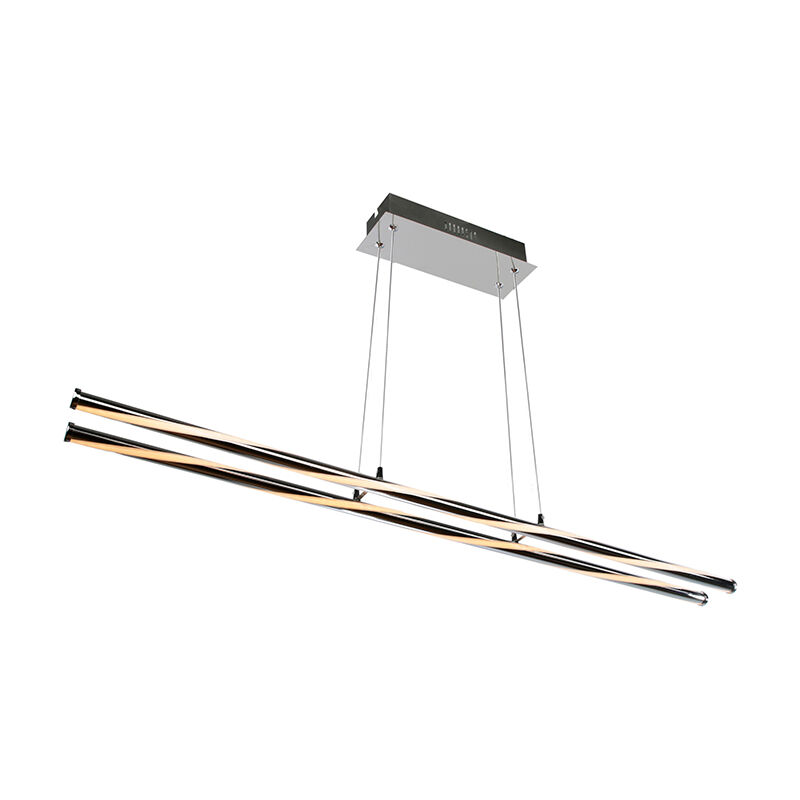 Lampada a sospensione dal design moderno con linee dinamiche che producono un effetto luminoso a 360°. Progettata per dare a qualsiasi ambiente un tocco moderno e originale. Finitura cromata e regolabile in altezza. Luce bianca neutra (4000K) di 2650lm. Dimensioni: 90x8,5x120 cm.