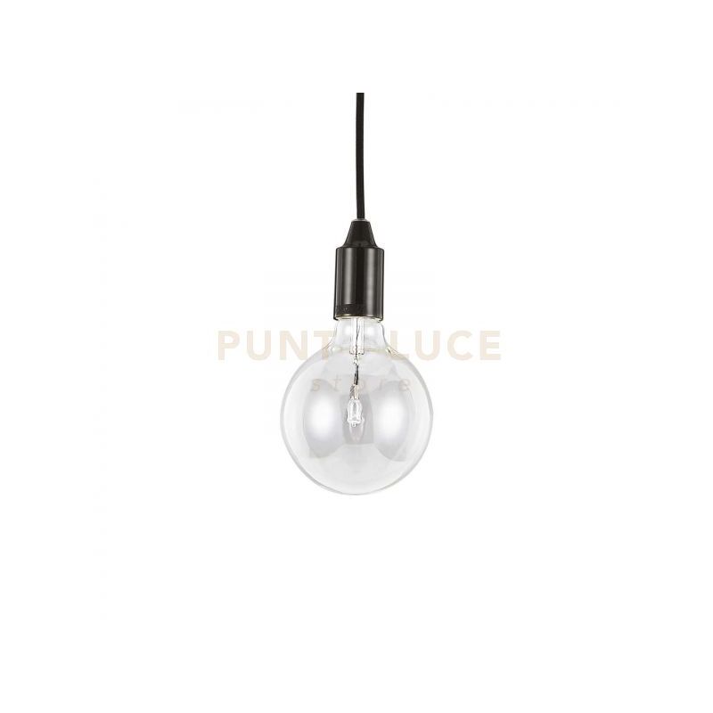 Pendente con rosone e copri porta a lampada in metallo rifinito con vernice opaca bianca o nera. Cavo elettrico in tessuto.