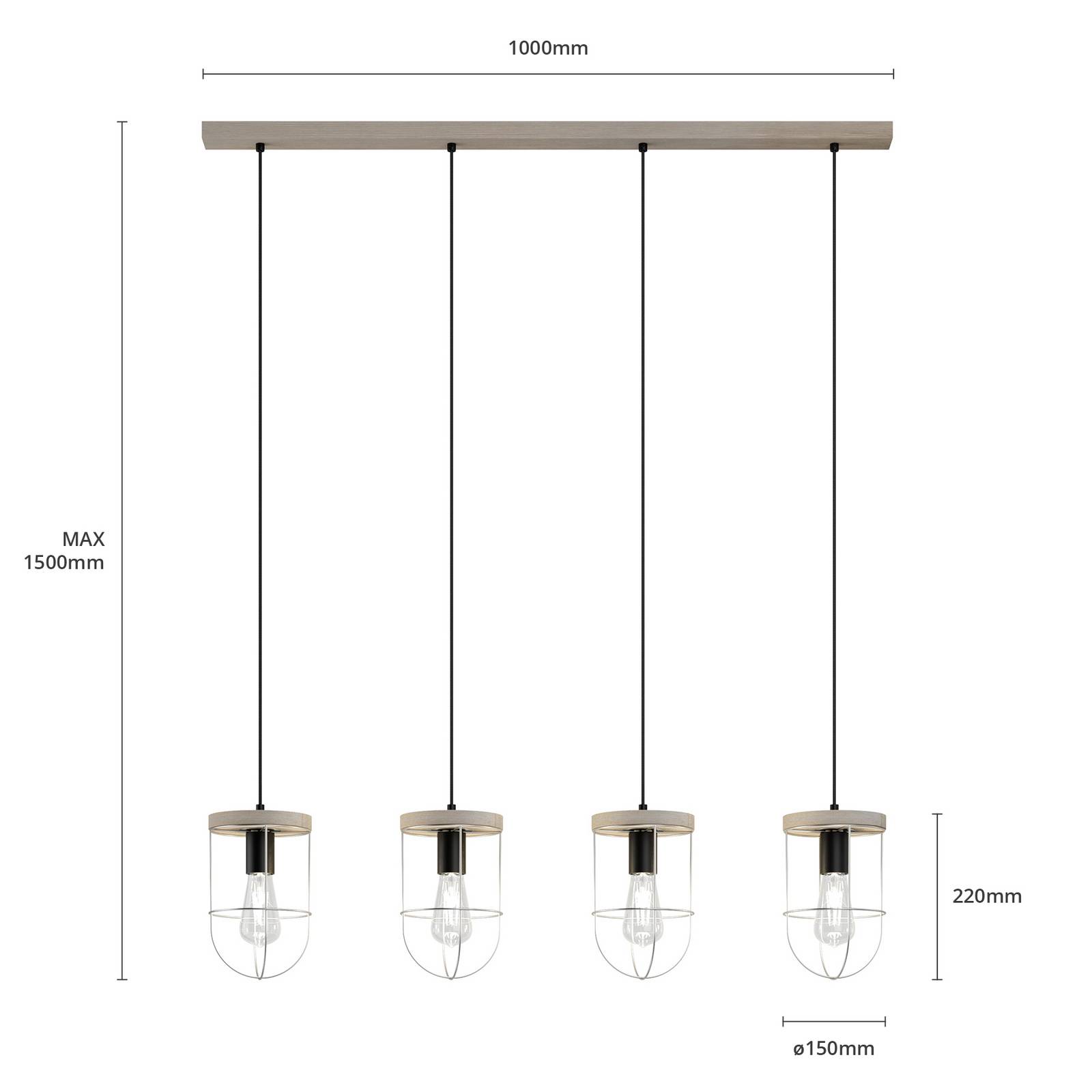 Lampada a sospensione a 4 luci Neptuna in legno di pino e metallo La lampada a sospensione Neptuna è costituita da un rosone allungato da cui pendono quattro paralumi. Come il rosone, anche i supporti dei paralumi sono in legno di pino e il supporto della sorgente luminosa si trova al centro. Le sorgenti luminose non sono incluse e possono essere selezionate liberamente in base alla portalampada appropriata. In questo modo, le condizioni di illuminazione della zona giorno possono essere personalizzate in base alle preferenze personali. La combinazione di colori grigi e il gioco di materiali creano un effetto molto armonioso, rendendo l'apparecchio facile da integrare in diversi spazi abitativi. Ad esempio, Neptuna fa bella figura sopra il tavolo da pranzo o del soggiorno. Oltre alla sua funzione di fonte di luce, la lampada è anche un bellissimo elemento decorativo e colpisce per i suoi paralumi a forma di lanterna. Il legno di pino utilizzato è certificato FSC e proviene da aree di coltivazione gestite in modo sostenibile. Le lampade del marchio Envostar sono prodotte in Europa. I brevi percorsi di trasporto consentono una significativa riduzione delle emissioni di CO2. Neptuna viene inoltre spedita in imballaggi realizzati con materiali riutilizzabili.