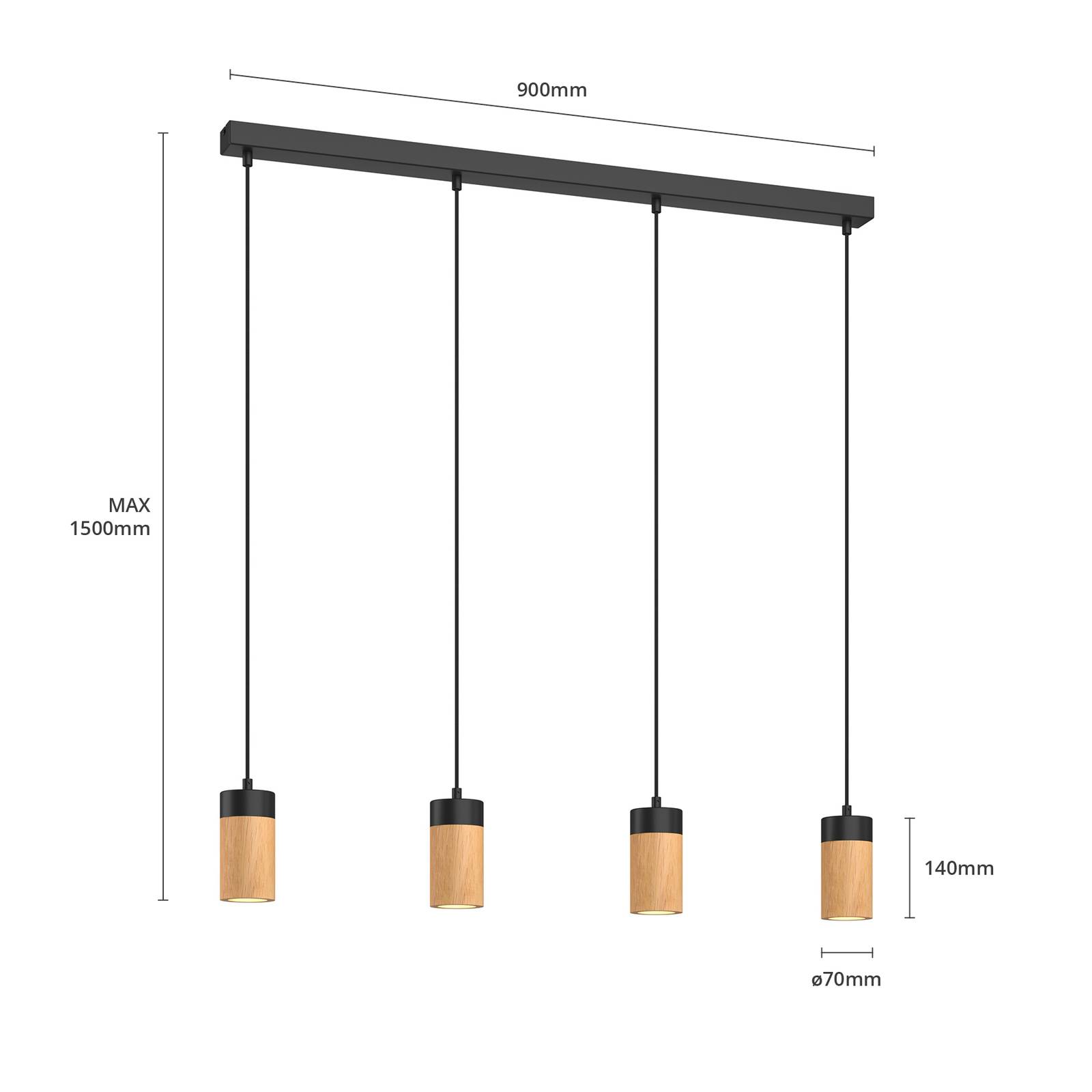 Lampada a sospensione Plain a 4 luci in metallo e legno di quercia oliato La lampada a sospensione Plain a 4 luci combina i materiali metallo e legno di quercia per creare un bellissimo contrasto visivo. Anche la combinazione di colori del nero e del legno chiaro contribuisce a questo contrasto e rende la lampada a sospensione un'attrazione speciale. Il legno di quercia aggiunge un tocco naturale all'ambiente circostante. I paralumi, fissati al rosone con un cavo di tessuto, sono di forma cilindrica ed emettono luce verso il pavimento. Plain è quindi ideale per illuminare tavoli o banconi di grandi dimensioni. La lampada a sospensione può essere utilizzata, ad esempio, in soggiorno o in sala da pranzo, ma è altrettanto adatta all'uso nel settore della ristorazione. Il marchio Envostar attribuisce grande importanza alla sostenibilità dei suoi prodotti. Il legno di quercia utilizzato per Plain proviene da aree ecologiche ed è certificato FSC. Poiché le lampade sono prodotte in Europa, le distanze di trasporto sono brevi e le emissioni di CO2 sono ridotte. Plain viene spedita in un imballaggio realizzato con materiali riciclabili.