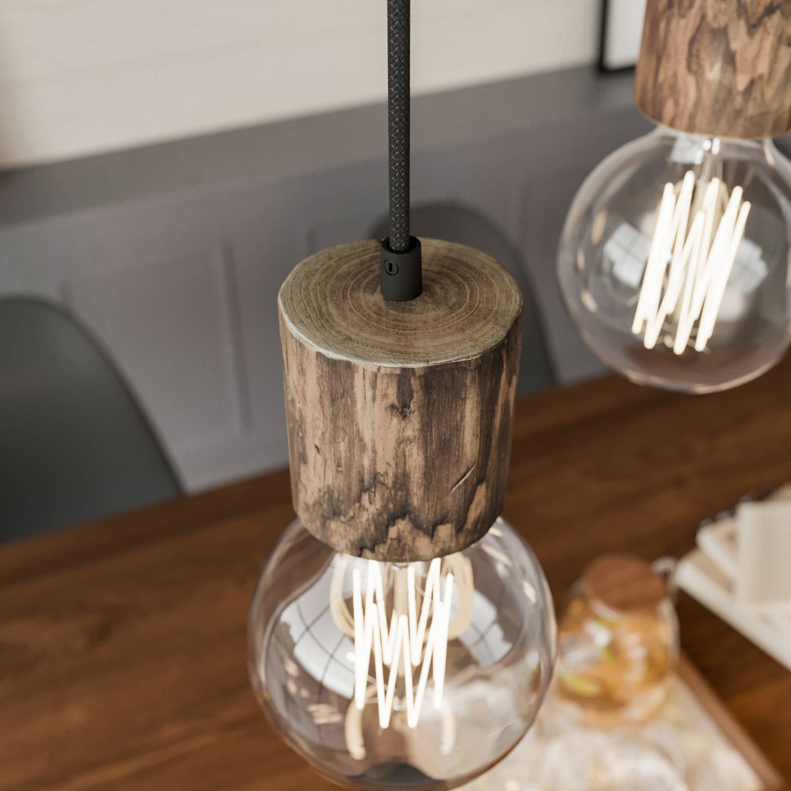 Lampada a sospensione Terra a 5 luci con trave rustica in legno di pino scuro La caratteristica della lampada a sospensione Terra è la trave decorativa in legno a cui sono fissate cinque prese di luce tramite un tessuto nero. I cavi sono avvolti intorno alla trave e la lunghezza della sospensione può essere regolata. La trave e i portalampada sono realizzati in legno di pino tinto in finitura noce e creano un aspetto naturale e accogliente nell'ambiente abitativo. La lampada a sospensione si integra perfettamente sopra i tavoli del soggiorno o della sala da pranzo e le fonti luminose possono essere selezionate liberamente in base alle preferenze personali. Insieme ai cavi tessili regolabili in lunghezza, le condizioni di illuminazione possono essere adattate in modo ideale alle esigenze individuali e alle condizioni del luogo. Le sorgenti luminose decorative sono particolarmente adatte per l'illuminazione, in quanto la loro vista è libera. Il marchio Envostar attribuisce grande importanza alla sostenibilità nella produzione delle sue luci. Il legno di pino utilizzato proviene da regioni ecologiche ed è certificato FSC. La produzione in Europa comporta percorsi di trasporto brevi, con un impatto positivo sulle emissioni di CO2. Terra viene spedita in imballaggi realizzati con materiali riciclabili.
