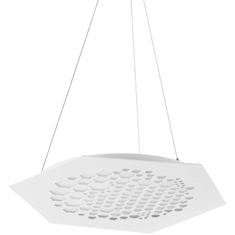 Lampada a sospensione Led ALVEARE e' composta da una lastra esagonale realizzata in metallo bianco opaco lavorato e intagliato a laser con diffusore in lastra polimerica. Cavetti regolabili in lunghezza e superficie orientabile. Questa sospensione moderna puo' adattarsi in modo unico e originale in ogni tipo di ambiente moderno ed essere collocata ad esempio nell'ingresso di casa, nel soggiorno, nell'open-space, nelle camere da letto,ma anche esercizi commerciali. La sorgente Led garantisce un ottima resa luminosa in tutta la stanza. CARATTERISTICHE Materiale: Metallo Colore: Bianco opaco Modello: Medio Tipologia: Sospensione Peso: 6 kg Dimensioni: Larghezza 52 cm / Altezza Max 125 cm Illuminazione: LED integrato Potenza: 33W 3300LM Input: 230V Colore luce: 3000K Classe energetica: A