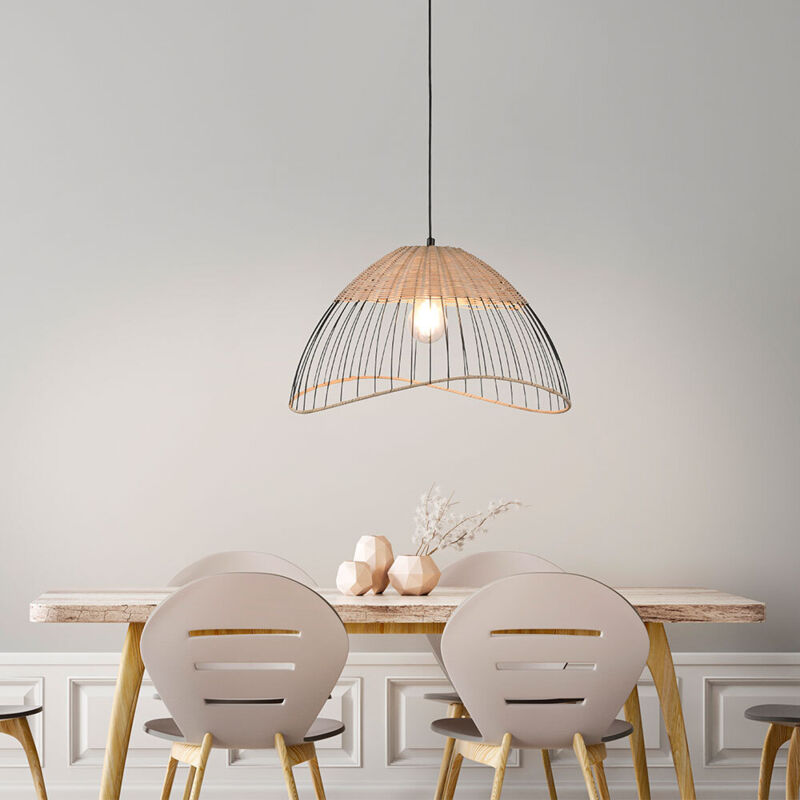 Descrizione Porta questo eye-catcher a casa tua. La combinazione di gabbia in metallo e rattan convince su tutta la sua lunghezza. Sia in camera da letto, in sala da pranzo, in soggiorno o in cucina. Questa lampada fa bella figura ovunque. Inserisci nella lampada una lampadina a tua scelta con attacco E27. Una lampadina decorativa qui è perfetta grazie alla chiara visione della sorgente luminosa. La lampada non è inclusa nella fornitura. Lampada dettagli • Tipo di lampada: lampada a sospensione • Materiale: metallo, legno • Colore: nero, naturale • Grado di protezione: IP20 • Aspetto rattan • Progettazione della gabbia • Diametro x altezza in cm: 48 x 120 • Attacco: 1x E27 • Lampadine non incluse • Potenza lampada: 1x massimo 60 watt • Voltaggio: 230 V, 50 Hz