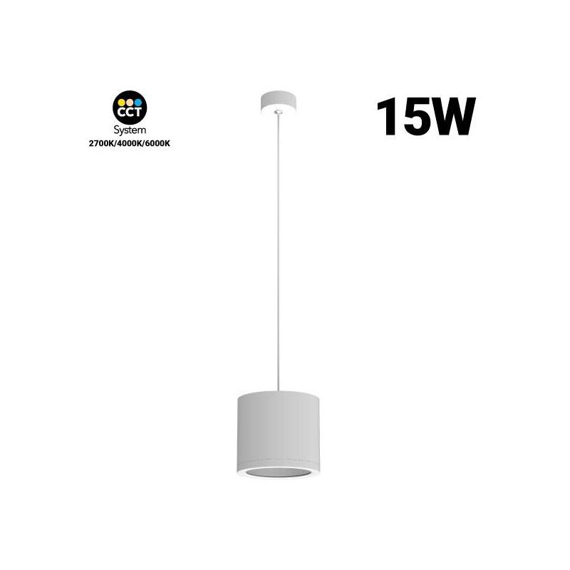 Lampade a sospensione CCT LED di forma cilindrica. Progettato in alluminio con una potenza di 15W. Ideale per l'installazione in cucine, corridoi, negozi, vetrine, hotel e bagni. Queste plafoniere sono dotate di un potente LED di tipo COB che fornisce un intenso fascio di luce con la massima efficienza e un'elevata intensità luminosa, pari a 1500 lumen. Facile da installare in qualsiasi tipo di soffitto. Con sistema CCT per regolare la temperatura con un solo pulsante cambiando tra (2700K;
