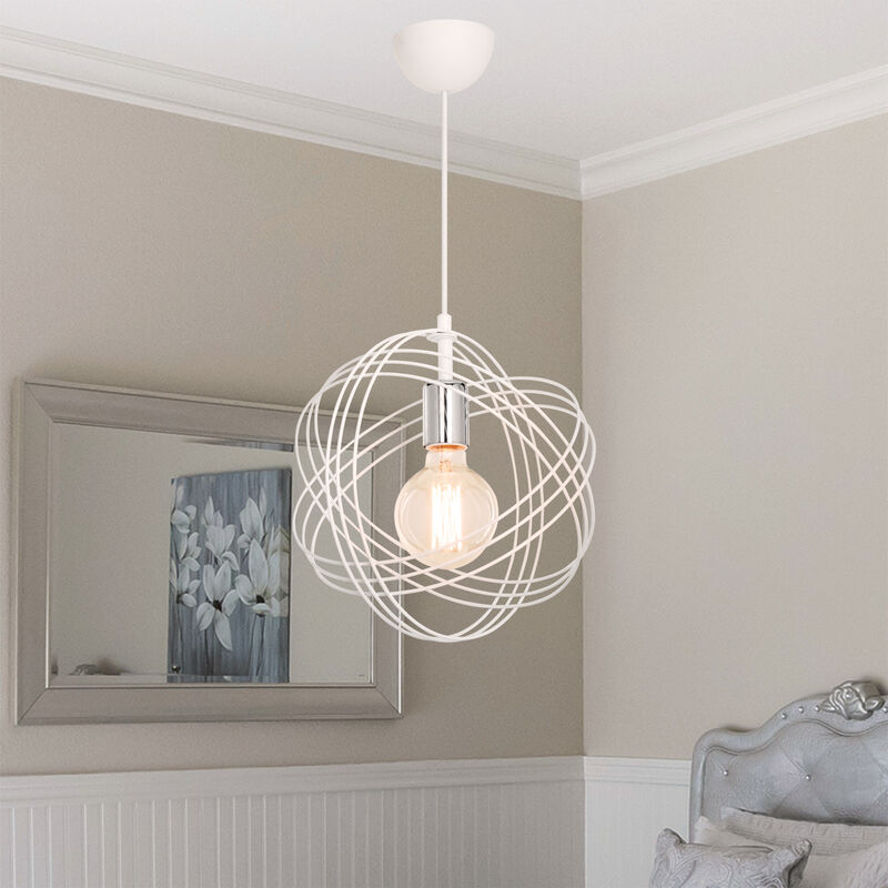 Lampada a sospensione Il modello da stile industriale illumina lo spazio d'intorno con luce intensa grazie alla paralume a gabbia. Caratteristiche: - paralume a globo fatto di cerchi - dotato di una sorgente luminosa - posizione ideale è a centro stanza Dati tecnici: - Attacco lampadina: 1 x E27, max. 20W (lampadina esclusa) - Tensione: 230V, 50Hz - Tipo di interruttore: a muro Materiale: Metallo Colore: Bianco / Argento Dimensioni: - Altezza completa: 75 cm - Paralume a gabbia (AxL): 30 x 28 cm La spedizione include: 1 x Lampada da soffitto [senza lampadina] Prodotto di [lux.pro]
