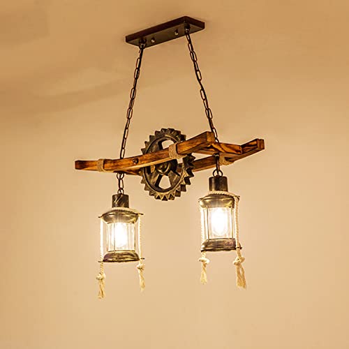 Lampada a Sospensione Industriale Vintage E27 Design In Stile Navale Retrò Legno Lampadario Rustico 2 Teste Corda di Canapa Edison per Tavolo da Pranzo Cucina Soggiorno Bar Cafe Light Ø55cm