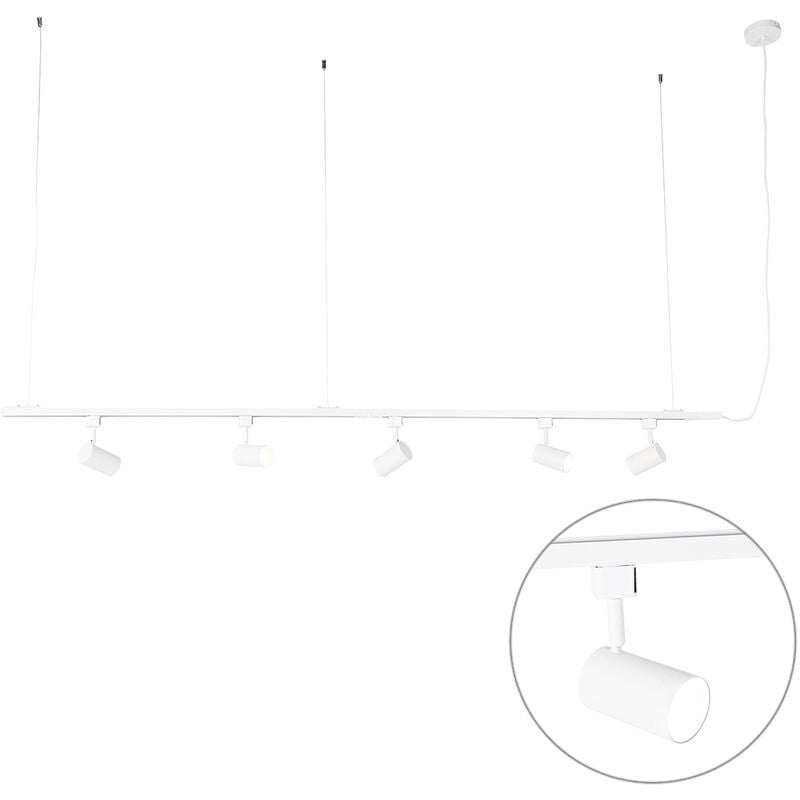 QAZQA Moderno sistema a binario sospeso con 5 faretti bianco monofase - Jeana Iconic Il sistema a binario sospeso bianco Jeana con cinque faretti si adatta perfettamente ai tuoi interni moderni. Il binario è lungo 193 cm, alto 200 cm e largo 9,5 cm. La piastra di montaggio ha un diametro di 10 cm e un'altezza di 2,5 cm. I faretti per binario possono essere completati con cinque lampadine GU10, ciascuna con una potenza massima di 50 watt. È possibile smorzare le lampadine con un dimmer esterno (non incluso). Si tratta di faretti per binario monofase, il che significa che tutti i faretti sono controllati insieme da un unico dimmer/interruttore della luce. I faretti possono essere regolati singolarmente, consentendo di determinare dove la luce illumina. Molto pratico! Completa i tuoi interni con questo elegante binario Jeana. Portalampada: GU10 . Max 5 x 50 W, 230 V Adatto a: LED Voltaggio: 220V/230V IP Classe di protezione: [IP20] A prova di polvere Funzioni extra: Regolabile: Dimmer