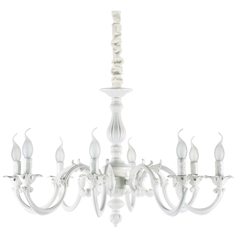Collezione Justine SHABBY CHIC STYLE Sospensione a 8 luci con rosone e montatura in metallo con bracci in fusione. Rifinito con vernice opaca bianca. Copricatena in velluto..