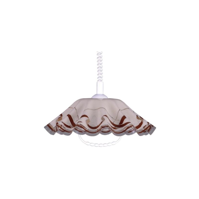 Un lampadario in stile vintage che introduce un'atmosfera unica. Immagina una cucina con elementi in legno, una stufa in maiolica e al centro del soffitto c'è la lampada K-3276 con paralume ondulato dai motivi delicati nei colori beige e bordeaux. Grazie a questa lampada tutta la stanza assume un'atmosfera accogliente e calda. Il paralume è in plastica. Questa è la scelta migliore se l'apparecchio deve essere appeso in cucina. Quindi puoi lavarla senza preoccupazioni e continuare a goderti la bellissima lampada. L'elevata funzionalità della lampada è il suo grande vantaggio. La lampada K-3276 è regolabile in altezza. Per facilitare questa operazione, il cavo è progettato a molla e sotto il parasole è presente una maniglia che consente di estendere la sporgenza. L'altezza totale della lampada è di 85 cm, ma può essere accorciata a circa 50 cm. Grazie a questo può essere appeso sia sopra il tavolo che come illuminazione principale della stanza. Sopra la maniglia è presente un portafilo