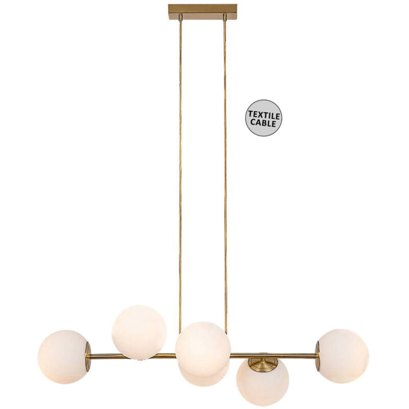 Lampada a sospensione KIARA E27 6x max.35W metallo oro, vetro bianco L: 91cm A: 90cm Ø13cm dimmerabile Dimensioni in mm: Larghezza: 910, altezza: 900, diametro: 130 Peso in kg: 2,3 Profondità di installazione in mm: 200 Tipo di lampadina/attacco: E27 Lampadine incluse: NO Potenza in watt: 6x max.35W Grado di protezione: IP20 Dimmerabile: SÌ Materiale alloggiamento: Metallo Colore alloggiamento: oro Materiale vetro/paralume: Vetro Colore vetro/paralume: bianco
