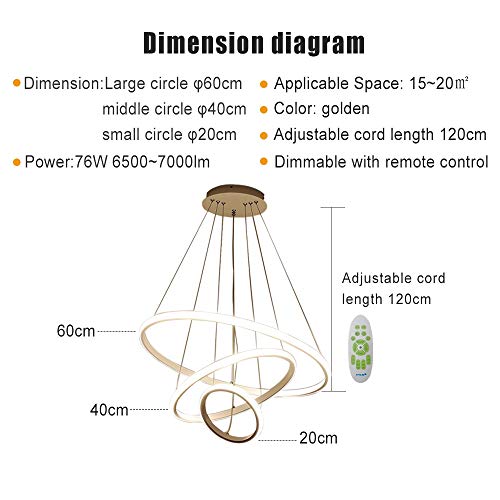 3. I parametri del lampadario: cerchio grande φ60cm * cerchio centrale φ40cm * cerchio piccolo φ20cm, altezza regolabile 120cm, potenza 76W 6900lm, adatto per 10 ~ 20㎡.
