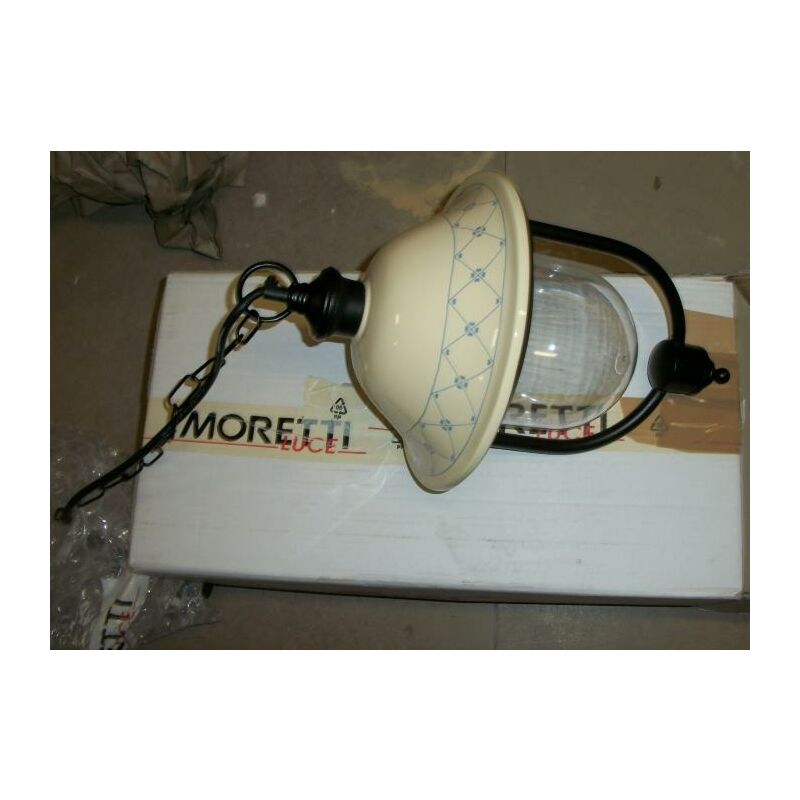 Lanterna a sospensione PER ESTERNO, con cappello in ceramica avorio decorata, diffusore trasparente e struttura in alluminio verniciato nero;
