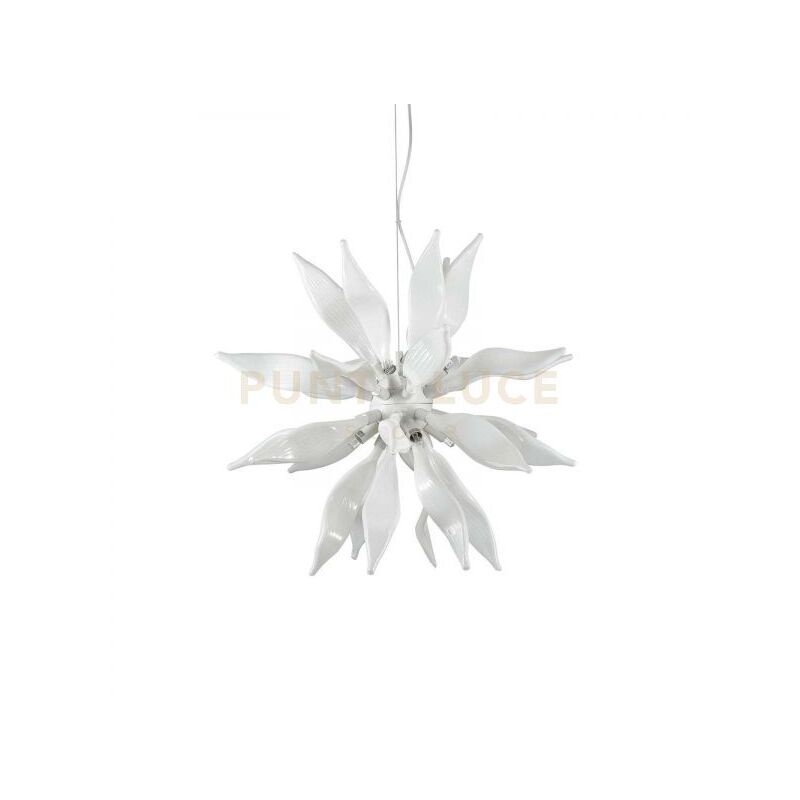 Lampada a sospensione con montatura in metallo bianco. Elementi decorativi in vetro soffiato bianco e modellato a mano. Cavi d'acciaio regolabili in lunghezza.