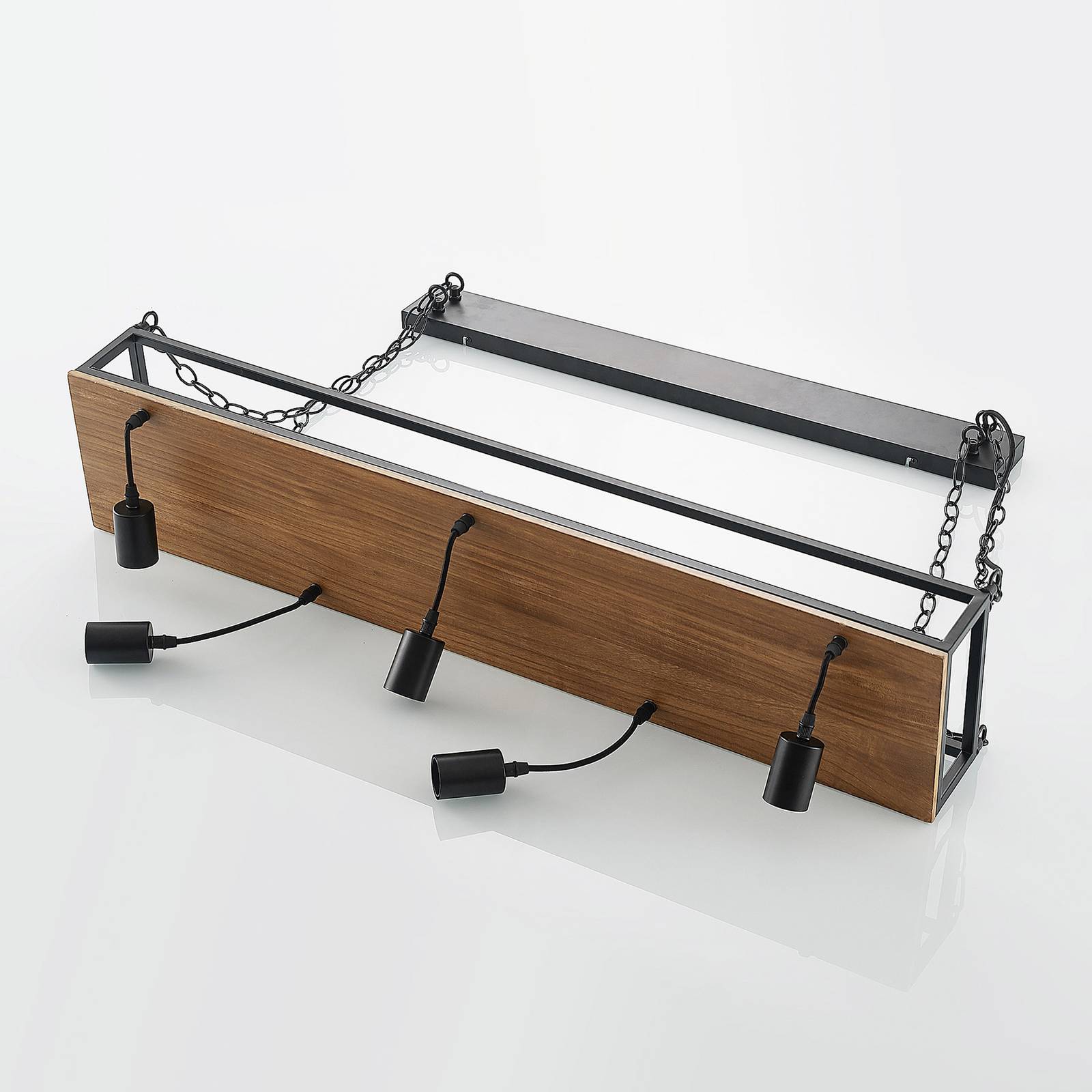 Lampada a sospensione a 5 luci Kirista con piastra in legno scuro e struttura in ferro nero e sospensione a catena Questa lampada a sospensione è un bellissimo elemento di spicco per la cucina e la zona giorno e dovrebbe essere montata idealmente sopra un tavolo o un bancone, dove le cinque fonti di luce possono fornire un livello di luminosità sufficiente per illuminare l'area. Le lampade sono sospese a diverse altezze e penzolano liberamente dalla struttura, mentre il piano in legno offre spazio per alcuni oggetti da collocare. Non si tratta solo di oggetti pratici, ma anche di oggetti decorativi che possono essere abilmente esposti in questo modo. Un vero e proprio richiamo visivo, ad esempio, è rappresentato dal verde fresco sotto forma di piante compatte in vaso, che non solo ravvivano l'atmosfera della stanza con l'aria fresca, ma anche con il loro aspetto fresco. La sospensione a catena completa in modo appropriato il look vintage della lampada a sospensione in metallo nero e garantisce una tenuta stabile. La mensola può essere caricata con un massimo di 15 kg.