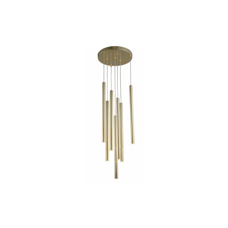 LUNGO 7 GOLD LAMPADA A SOSPENSIONE - è una lampada a sospensione apparentemente modesta, ma accattivante. Il suo design attira l'attenzione degli altri. La lampada Lungo è realizzata con una struttura in metallo color oro. Alla base, la cornice ha la forma di un cerchio, da cui si dipartono 7 fili, che terminano con sorgenti luminose G9. Ciascuna estremità è racchiusa in tubi d'oro molto stretti. Inoltre, questi cavi sono sospesi a diverse altezze, il che conferisce uno straordinario effetto spaziale, non solo quando sono illuminati. È una decorazione in sé. Questa lampada è molto lunga, circa un metro e mezzo. Per quanto riguarda lo stile dell'apparecchio, è un'illuminazione perfetta per interni moderni e modernisti, anche se starà meglio in arrangiamenti esclusivi. Funzionerà perfettamente in soggiorno, in sala da pranzo, sopra il tavolo o nell'ingresso. Ti invitiamo a dare un'occhiata alle altre lampade della serie Lungo per abbinare la dimensione e il colore appropriati alle tue