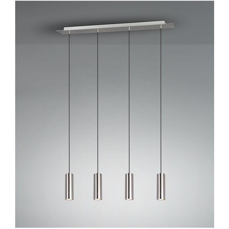Lampada a Sospensione 4 Luci Cilindri Nichel Marley La lampada a sospensione Marley di Trio Lighting è composta da rosone lineare rettangolare e 4 diffusori cilindrici, realizzata interamente in metallo di colore nichel opaco. Cavetti regolabili in lunghezza che permettono di variare l'altezza di ogni punto luce in modo da creare disposizioni uniche e personalizzate. Dotata di 4 alloggi per lampadine con attacco GU10 da max 35 watt (acquistabili separatamente). Una lampada versatile, dal design lineare e moderno, ideale per illuminare in maniera diretta e diffusa piani sottostanti. Consigliata da collocare sopra la penisola della cucina o anche sopra tavoli e banconi di locali commerciali, come bar e ristoranti. Caratteristiche Articolo disponibile in diverse colorazioni: nichel, bianco, nero e ruggine.
