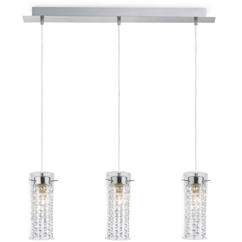 Collezione Iguazu' CHIC E GLAMOUR Sospensione a 3 luci con montatura in metallo cromato. Diffusore in vetro pirex e pendenti con ottagoni dicristallo. Cavi a lunghezza regolabile da dispositivi ferma cavo automatici.