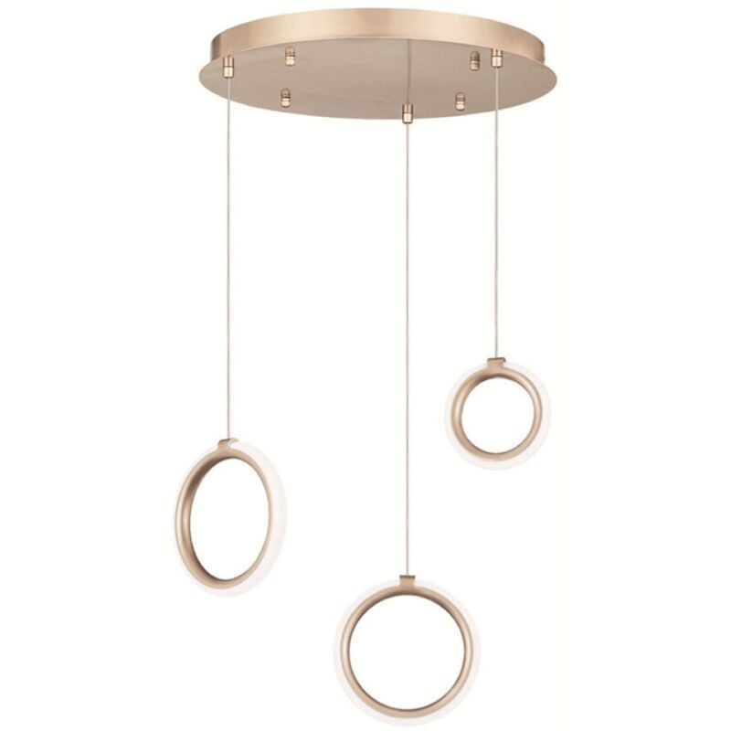Lampadario a sospensione PINTA con led integrato, interamente in metallo verniciato. Cavetti regolabili in lunghezza. Una lampada dal design moderno, perfetta per arredare e illuminare ogni spazio della vostra casa con un tocco di originalita'. CARATTERISTICHE Colore: Oro Materiale: Metallo Tipologia: Lampada a sospensione Modello: 3 luci Altezza max: 200 cm DIametro: 35 cm Dimmerabile: Si Illuminazione: LED integrato Potenza: 25W 1470-2500 LM Input: 220-230V Colore luce: 3000K