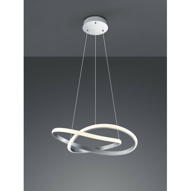 Lampada a Sospensione Moderna Dimmerabile Ø60 cm COURSE di Trio Lighting è una lampada a sospensione composta da un profilo in metallo finitura nichel opaco con diffusore a forma di spirale in plastica bianca. Disponibile anche la variante nella finitura antracite e bianco. I cavi in acciaio permettono di regolare l'altezza e l'inclinazione del diffusore così da creare la configurazione che più vi aggrada. Dotata di modulo led integrato SMD LED 27 watt, 2700 lumen, 3000k (luce calda). L'intensità della luminosità può essere regolata in modo graduale grazie al dimmer integrato che vi permetterà di ottenere diverse tipologie di illuminazione, dalla più potente per illuminare con efficienza la stanza alla più tenue per creare sempre l'atmosfera giusta in ogni occasione. Multifunzionale, moderna e originale, questa lampada è ideale per chi è alla ricerca di un elemento che illumini e al tempo stesso arredi con stile e originalità ogni ambiente della casa, dal soggiorno living alla sala da