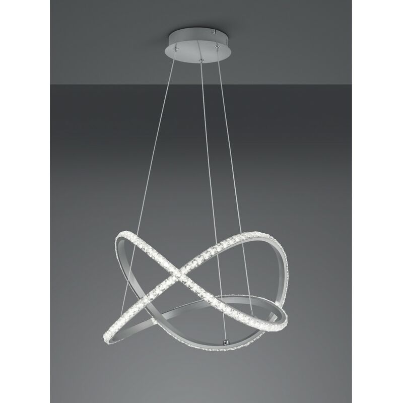 Lampada Sospensione Moderna Rubin Led Dimmerabile RGB Effetto Cristallo Ø50 cm RUBIN di Trio Lighting è una lampada a sospensione composta da un profilo in metallo finitura alluminio spazzolato con 2 diffusori a forma di anelli concentrici in plastica trasparente, telecomando in dotazione. I cavi in acciaio permettono di regolare l'altezza e l'inclinazione dei diffusori così da creare la configurazione che più vi aggrada. Dotata di modulo led integrato SMD LED 26 watt, 2350 lumen, 3000k (luce calda), con dispositivo di variazione del colore RGBW (luce rossa, verde, blu e bianca). L'intensità e il colore della luce possono essere regolate in modo graduale grazie al dimmer integrato che vi permetterà di ottenere diverse tipologie di illuminazione, dalla più potente per illuminare con efficienza la stanza alla più tenue e colorata per creare sempre l'atmosfera giusta in ogni occasione. Include impostazione luce notturna. L'ultimo settaggio selezionato verrà memorizzato e usato alla prima