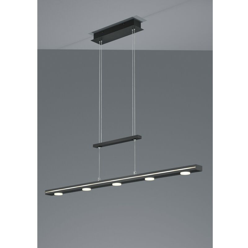 Lampada Sospensione Nera Piastra Rettangolare 7 Led La lampada a sospensione LACAL di Trio Lighting è composta da un profilo in metallo di colore nero opaco con 7 diffusori rotondi in acrilico bianco a led integrato, 5 dei quali rivolti verso il basso e 2 che illuminano il soffitto e rendono la luce più uniforme e confortevole. Cavetti regolabili in lunghezza che consentono di gestire l'altezza della piastra rettangolare secondo le proprie esigenze. Dotato di 7 SMD LED integrati, ognuno da 3,5 watt, 370 lumen, 3000k + 5000k (luce calda e luce fredda). L'intensità ed il colore della luce di questa lampada possono essere facilmente variati grazie al sensore touch, attivato da dimmer incluso. Non adatto a dimmer esterno. Un elemento dal design moderno che, grazie alla sua resa luminosa risulta essere perfetta per illuminare grandi ambienti abitativi in modo unico ed originale. Ideale per essere collocata ad esempio sopra il tavolo della sala da pranzo o la scrivania di un ufficio