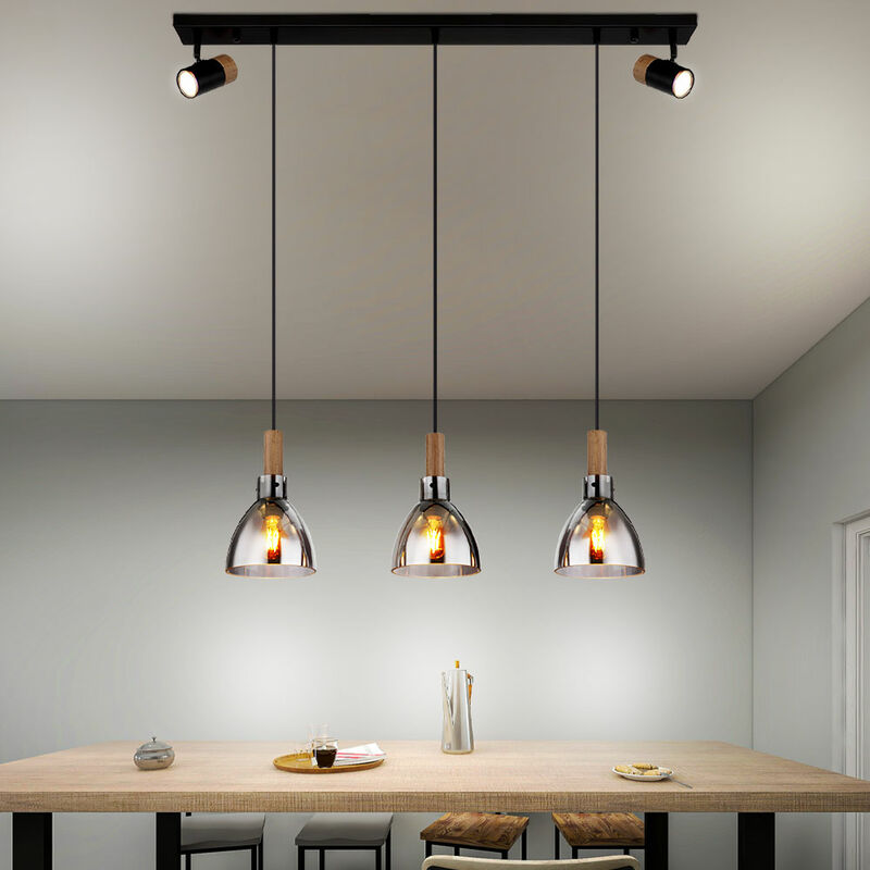 Descrizione Questa bellissima lampada a sospensione ispira con un grande design. Due faretti GU10 con decorazioni effetto legno sono fissati a un apparecchio da soffitto lungo 95 cm. Tre cavi lunghi 1,2 m conducono ciascuno a una presa E27, dotata di eleganti paralumi in vetro fumé. La presa E27 consente di determinare autonomamente il colore della luce e la luminosità fino a una potenza massima di 6 watt. A causa della longevità e del risparmio energetico, consigliamo le lampadine a LED. Le lampadine non sono incluse! Particolare lampada • Tipo di lampada: lampada a sospensione • Materiale: metallo, vetro, MDF • Colore: nero, fumé • Grado di protezione: IP20 • Classe di protezione: 2 • Diametro paralume in cm: 16 • Lunghezza x larghezza x altezza in cm: 95 x 16 x 120 • Portalampada principale: 3x E27 • Presa spot: 2x GU10 • Lampadina inclusa: No• Potenza lampadina principale: 3x max 9 W • Potenza spot lampada: 2x massimo 5 W• Alimentazione: 230V, 50Hz